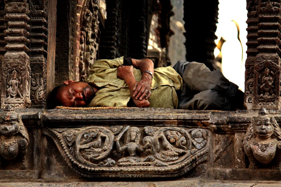 Un homme se repose au pied d'un temple - Katmandou